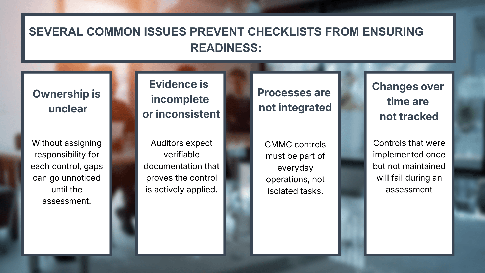 Consider a contractor who checked off every item on a CMMC checklist without validating active implementation. During the official assessment, auditors discovered incomplete access logs and inconsistent incident response procedures. The contractor failed the assessment, delayed a contract award, and incurred extra costs to remediate deficiencies. Real-world examples like this highlight why checklists alone cannot guarantee readiness.